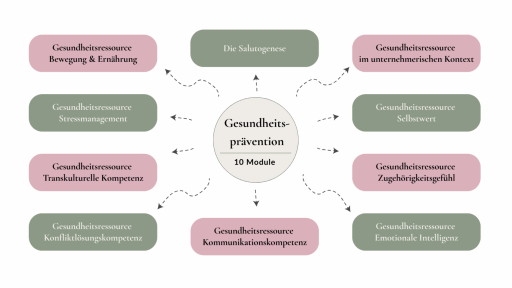 Dieses Modul führt in die Theorie der Salutogenese, der Lehre vom Ursprung der Gesundheit, ein und vermittelt das Gesundheits-Krankheits-Kontinuum. Im Fokus stehen Gesundheitsressourcen, Resilienz und subjektive Gesundheitsvorstellungen. Durch praktische Übungen lernen die Teilnehmenden, persönliche und soziale Ressourcen zu erkennen und zu stärken.
